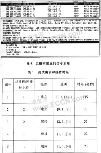 首先,為了評估經(jīng)過擴展后的控制平面與傳統(tǒng)的單播連接的兼容性,分別建立了一條從OXC 1出發(fā)的組播樹和單播連接,結(jié)果如表1所列。圖6顯示了Ethereal捕獲的組播樹建立的信令消息。在解開的Path消息中,可以發(fā)現(xiàn)經(jīng)過擴展的UNI組播對象。然后,對已存在的連接進行了動態(tài)的修改。在第三個測例中,一個葉子被添加到單播連接上并使其變?yōu)橐豢媒M播樹。在嫁接和剪枝的操作中,業(yè)務生成器在已建立的連接上沒有觀察到丟包的現(xiàn)象。