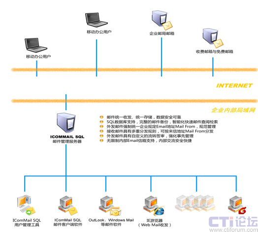 IComMail SQL企業(yè)郵件管理系統(tǒng)是埃康軟件推出的優(yōu)秀的郵件管理軟件,自2003年首推自今已有5年的發(fā)展歷史,系統(tǒng)設(shè)計(jì)先進(jìn)、功能獨(dú)特完整、運(yùn)行穩(wěn)定可靠,在國(guó)內(nèi)已有大批裝機(jī)用戶(hù),其中以外貿(mào)、進(jìn)出口等外向型企業(yè)為主要用戶(hù)群,廣大用戶(hù)已經(jīng)獲得了極大的受益。IComMail SQL系統(tǒng)主推的是其強(qiáng)大的郵件管理功能,與通常的郵件服務(wù)器Mail Server系統(tǒng)有著根本的區(qū)別,也有別于日趨流行的企業(yè)郵局服務(wù),IComMail SQL系統(tǒng)是建立在通常的郵件服務(wù)器Mail Server或企業(yè)郵局的應(yīng)用基礎(chǔ)上的,在企業(yè)局域網(wǎng)內(nèi)設(shè)立一IComMail郵件管理服務(wù)器,并采用穩(wěn)定可靠的SQL數(shù)據(jù)庫(kù)系統(tǒng)作為支撐,為企業(yè)建立安全可靠的企業(yè)郵件數(shù)據(jù)中心,并在此基礎(chǔ)上,擴(kuò)展了很多高級(jí)的企業(yè)郵件管理功能,使企業(yè)的郵件應(yīng)用水平有質(zhì)的提升。