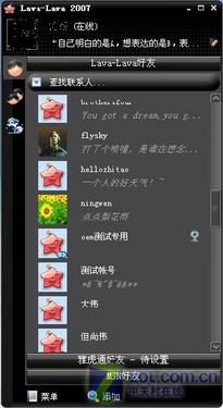 而Lava-Lava更是將整合功能發(fā)揮得淋漓盡致。上了Lava-Lava,還得惦記著MSN和雅虎通的好友,都登錄吧,不僅占用內(nèi)存資源還嫌麻煩,現(xiàn)在不用再發(fā)愁了,新版lava不僅已經(jīng)集成了MSN好友分組,還可以與雅虎通的好友互通,以后能在lava-lava上直接與MSN或雅虎通好友交流了。操作方法相當簡單,在你的主界面,添加MSN和雅虎通好友分組即可(圖14)。