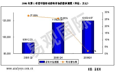 新華美通消息:易觀國際研究表明,2006年第一季度,CRBT 業(yè)務(wù)整體市場規(guī)模達到16億元,環(huán)比增長率為5%,增長速度較上個季度大幅度下降,業(yè)務(wù)已經(jīng)進入低級飽和期。其中中國移動的彩鈴業(yè)務(wù)的市場規(guī)模環(huán)比增長率僅僅為2%,如果扣除中國移動和中央電視臺合作進行的春晚彩鈴業(yè)務(wù)收入,中國移動彩鈴業(yè)務(wù)市場規(guī)模實際略有下降。圖:2006年第一季度中國移動彩鈴市場規(guī)模