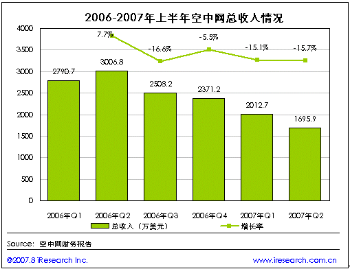 空中網(wǎng)2007年第二季度財報數(shù)據(jù)顯示,第二季度空中網(wǎng)的總收入1695.9萬美元,同比負增長43.6%,環(huán)比負增長15.7%。與第一季度相比在空中網(wǎng)兩個產(chǎn)品平臺的主要2G業(yè)務和2.5G的業(yè)務收入都出現(xiàn)了不同程度的下降,但2G業(yè)務中的IVR業(yè)務收入則出現(xiàn)了大幅上升。搜狐IT