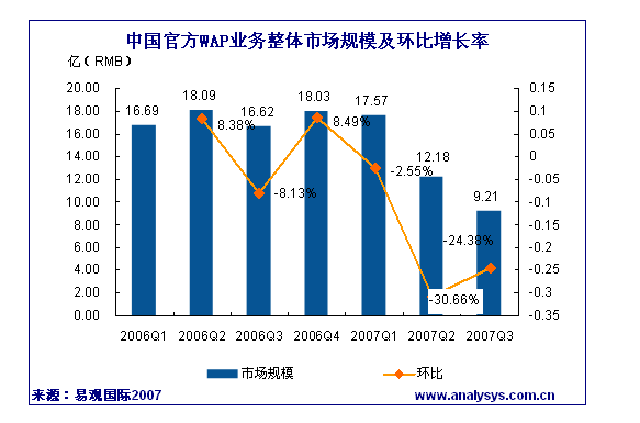 易觀國際研究表明,2007年第3季度中國官方WAP市場規(guī)模達(dá)到9.21億人民幣,同比下降44.57%。中國移動WAP頁面“資費(fèi)提醒”政策對市場的影響已得到控制,與2季度WAP市場規(guī)模逐月遞減現(xiàn)象相比,2007年7月、8月、9月WAP市場規(guī)模呈現(xiàn)穩(wěn)步增長趨勢。中國聯(lián)通WAP市場規(guī)模為1.065億元,同比下降47.55%,自中國聯(lián)通四月份改實(shí)收結(jié)算后,信息費(fèi)一直呈現(xiàn)下降趨勢。通信產(chǎn)業(yè)網(wǎng)