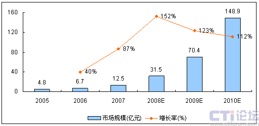 馳昂咨詢(Sinotes)發(fā)布的《2007-2008年中國移動增值業(yè)務(wù)市場研究年度報告》顯示,截止至2007年底,中國移動即時通信(IM)市場規(guī)模已經(jīng)達到12.5億元。而隨著3G時代的來臨,在電信運營商的積極推動下,國內(nèi)移動IM市場必將步入快速增長期,預(yù)計未來三年增長率都將在100%以上。CTI論壇編輯