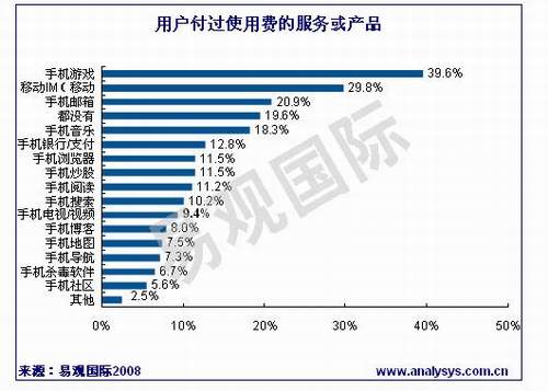 據(jù)易觀國際《中國手機應(yīng)用市場用戶調(diào)研報告2008》研究發(fā)現(xiàn),用戶付過使用費的手機應(yīng)用服務(wù)及產(chǎn)品中,手機游戲、移動IM和手機郵箱的比例較高。其中39.6%的手機應(yīng)用用戶付費玩過手機游戲,29.8%的用戶曾經(jīng)為移動IM付費,而手機郵箱的付費用戶將達20%。其他手機應(yīng)用產(chǎn)品或服務(wù)中,付費用戶的比例相當(dāng),均在10%左右,但是有近20%的用戶沒有用過任何的付費服務(wù)或產(chǎn)品。易觀國際