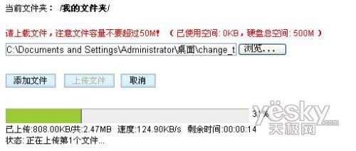 相對(duì)而言189在網(wǎng)絡(luò)硬盤(pán)功能方面則優(yōu)越很多,除了硬盤(pán)空間的容量外,支持上傳文件的進(jìn)度條顯示,而且上傳速率也不錯(cuò),基本穩(wěn)定保持在120KB/s。
