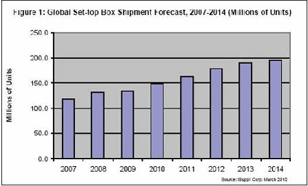 據(jù)iSuppli公司,機(jī)頂盒出貨量未來幾年將繼續(xù)增長。消費(fèi)者收看模式發(fā)生轉(zhuǎn)變,通過互聯(lián)網(wǎng)提供的電視內(nèi)容越來越流行,從而將為提供商創(chuàng)造條件,在數(shù)字家庭的激烈爭奪中獲得新的營業(yè)收入來源。國際電子商情