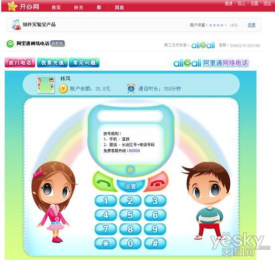 近日,阿里通網(wǎng)絡電話與國內(nèi)著名社交網(wǎng)站開心網(wǎng)合作,推出了定位于年輕族群,專為SNS網(wǎng)站量身定做的flash版網(wǎng)絡電話。開心網(wǎng)用戶只需在組件實驗室中添加阿里通flash網(wǎng)絡電話,無須注冊和安裝任何插件,即可直接在開心網(wǎng)網(wǎng)頁上撥打全球任意的手機和固話。據(jù)悉,為了讓更多的用戶能體驗到flash網(wǎng)絡電話的便利,只要開心網(wǎng)內(nèi)的好友達到5人,添加組件成功后都可獲贈一定的免費通話時長。天極網(wǎng)