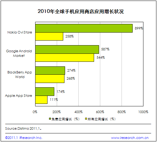 iResearch艾瑞咨詢整理Distimo最新公布數(shù)據(jù)發(fā)現(xiàn),2010年全球手機應用商店免費應用大幅增長。數(shù)據(jù)表明,諾基亞Ovi Store免費應用增長速度最快,增長率為899%,谷歌Android Market和RIM的BlackBerry App World次之,增長率分別為587%和274%.艾瑞咨詢