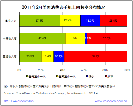 iResearch艾瑞咨詢整理Affluence Collaborative最新數據發(fā)現,相比普通收入者,美國中高端收入人群通過手機上網的頻率更高,有37.5%的高收入者(年收入50萬美元以上)每天手機上網至少一次,有高達42.6%的中等收入者(年收入20-50萬美元)每天上網至少一次,而此比例在普通收入者中只占20.3%,近六成的普通收入者從未使用手機上網。艾瑞咨詢