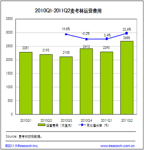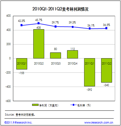 9月7日,麥考林發(fā)布2011年Q2財報。艾瑞通過整理發(fā)現(xiàn),麥考林凈營收為5873萬美元,與去年同期基本持平,其中線上渠道凈營收3271萬美元,同比增長25.9%;營收成本3728萬美元,同比上升16.8%,其中線上渠道營收成本為2431萬美元,同比增長55%;利潤方面,2011年第二季度凈虧損為340萬美元,2010年同期凈利潤為408萬美元。艾瑞咨詢
