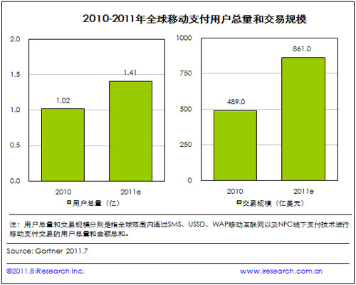 整理Gartner的最新數(shù)據(jù)研究發(fā)現(xiàn),預計2011年全球移動支付用戶規(guī)模將達到1.41億,較2010年增長38.2%;交易金額也將由2010年的489億美元增長至861億美元,增長率超過76%。該數(shù)據(jù)顯示,全球移動支付市場呈現(xiàn)穩(wěn)步增長態(tài)勢,而交易金額的增長速度遠遠超過用戶數(shù)量的增長速度也表明人們對于移動支付方式的依賴正在逐步加深。艾瑞