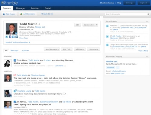 在一切皆可社會化的今天,客戶關(guān)系管理(CRM)服務(wù)的社交色彩也開始變得越來越濃。該領(lǐng)域內(nèi)的創(chuàng)業(yè)公司Nimble最近升級了它們的服務(wù),升級后的Nimble 2.0版更加強(qiáng)調(diào)社交信息的聚合管理,試圖給側(cè)重“信息輸入”的CRM服務(wù)領(lǐng)域帶來新變化。