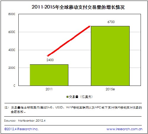 iResearch艾瑞咨詢整理Netbanker的最新數(shù)據(jù)發(fā)現(xiàn),2011年全球移動支付交易量達(dá)到2400億美元。該統(tǒng)計數(shù)據(jù)顯示,2015年全球移動支付交易量將達(dá)到6700億美元,使用手機(jī)銀行應(yīng)用程序的用戶數(shù)量較2010年將增加45%左右。另外,預(yù)計在未來18個月內(nèi)還會有20個國家增設(shè)NFC服務(wù)。艾瑞咨詢