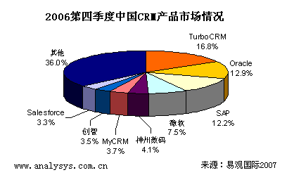 易觀國際研究表明,中國CRM產(chǎn)品市場2006年第4季度總體市場規(guī)模達到0.81億人民幣,季度增長率達到4.2%,體現(xiàn)了穩(wěn)健增長的趨勢。具體廠商方面,TurboCRM,Oracle(甲骨文),SAP位居領(lǐng)先地位。易觀網(wǎng)
