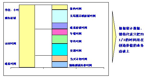 銷售資源是有限的,如何合理分配資源并確保最大的客戶機(jī)會和客戶價值是一個關(guān)鍵的問題。對于銷售代表,個人的時間是寶貴的資源。根據(jù)統(tǒng)計(jì)數(shù)據(jù),銷售人員只把約1/3的時間用于增值的業(yè)務(wù)洽談上,這意味著在銷售人員的時間管理上有很大的提升空間。如圖3-1所示。