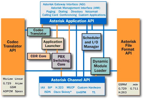 Asterisk具有傳統(tǒng)PBX無法比擬的優(yōu)點,那就是其靈活性,可擴展能力;Asterisk的擴展能力是通過開放相應(yīng)的架構(gòu)和接口來實現(xiàn)的。這就意味著Asterisk是一個組件而不是一個成型的產(chǎn)品,Asterisk的核心提供了一個基本的可運行環(huán)境,而外圍相應(yīng)的能力則可以通過加載和配置相關(guān)的插件和模塊來實現(xiàn)。