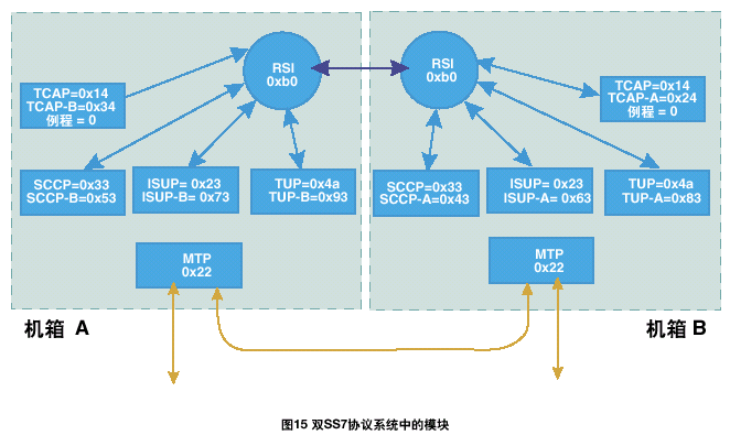 下圖展示了一個雙ISUP/TUP/SCCP/TCAP系統(tǒng)中各模塊之間的關(guān)系,以及系統(tǒng)兩部分的config.txt文件中的相應(yīng)條目。參見圖15。